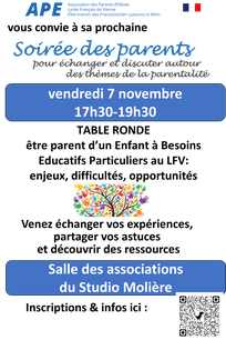 L'équipe de l'APE dédiée aux Enfants à Besoins Educatifs Particuliers (EBEP) organise un groupe de parole , jeudi 21 mars à 18h, dans la salle des associations du Studio Molière.
