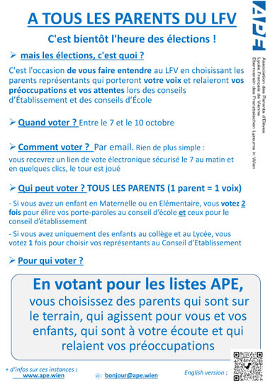 Tous les ans au début de l'année scolaire les parents d'élèves élisent leurs représentants au Conseil d'Ecole* et au Conseil d'Etablissement*.