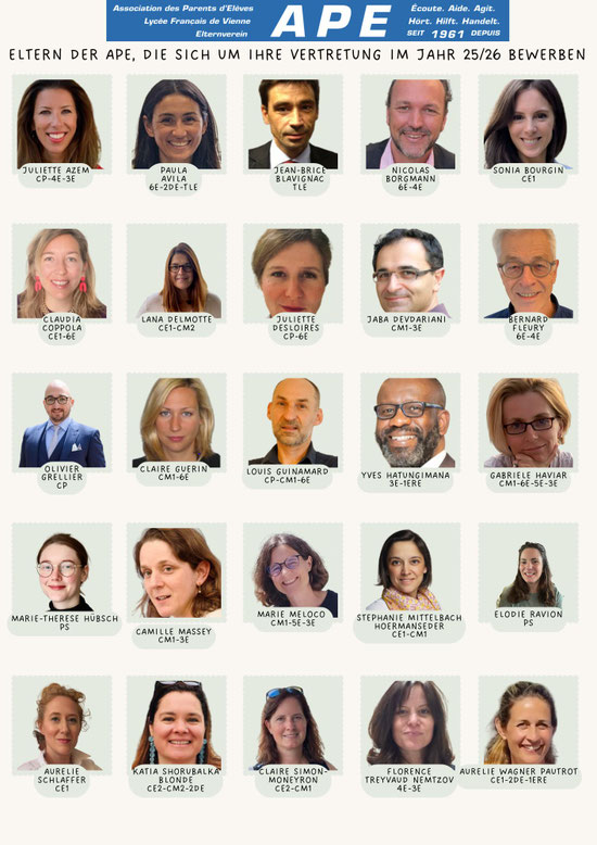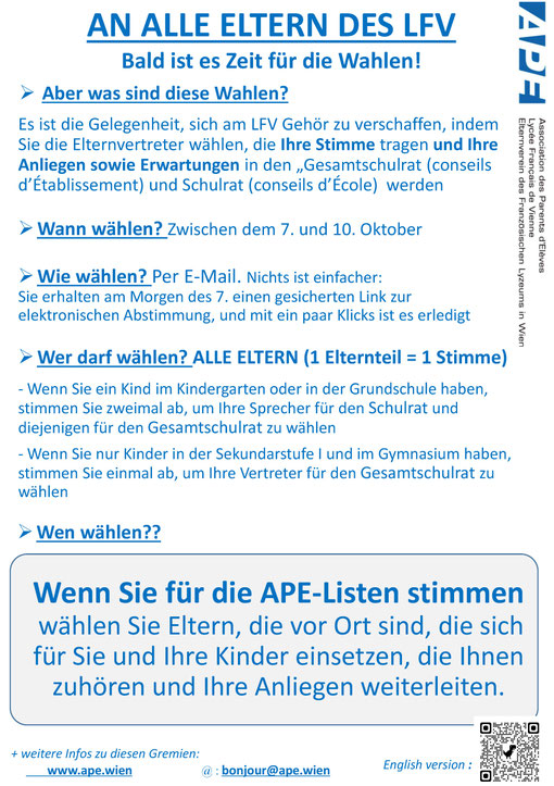 Jedes Jahr zu Beginn des Schuljahres wählen die Eltern der Schüler ihre Vertreter für den Conseil d'Ecole* (Volksschulrat für den Kindergarten und die Volksschule) und den Conseil d'Etablissement** (Schulrat). Ihre Aufgaben werden in der Mitte dieser Seite näher erläutert.